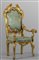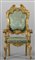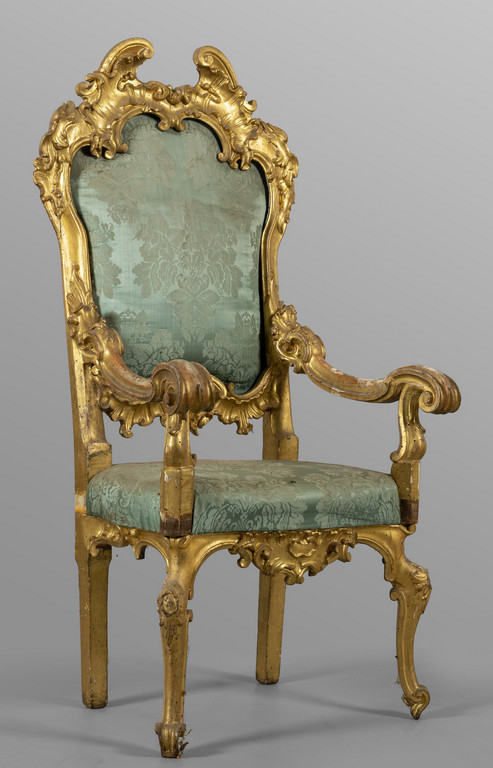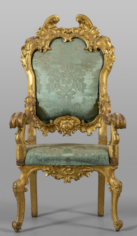 Trono Luigi XIV in legno intagliato e dorato copertura in damasco verde sec.XVIII (difetti e mancanze)