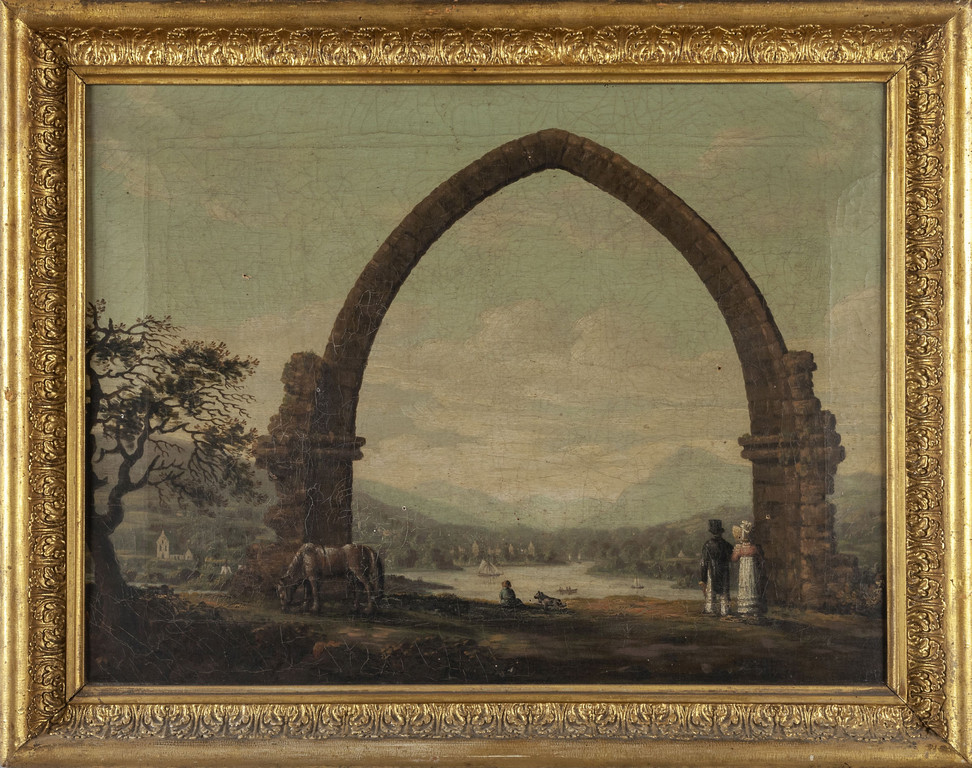 'A braccetto sotto l'arco' olio I metà sec.XIX cornice coeva in legno dorato