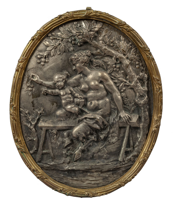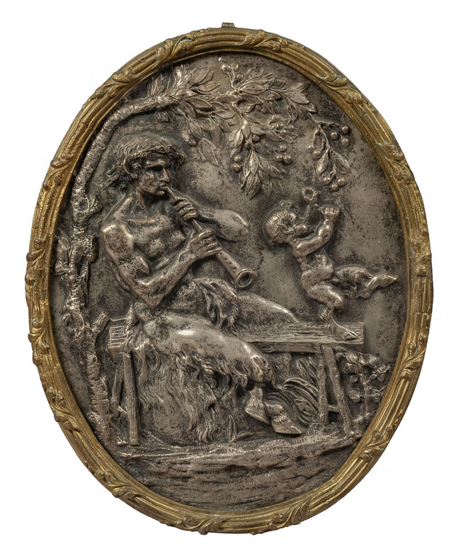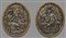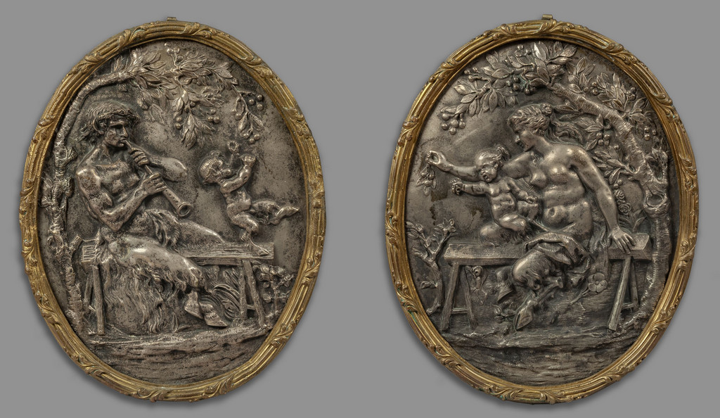 Coppia di medaglioni in metallo argentato di forma ovale raffiguranti satiri