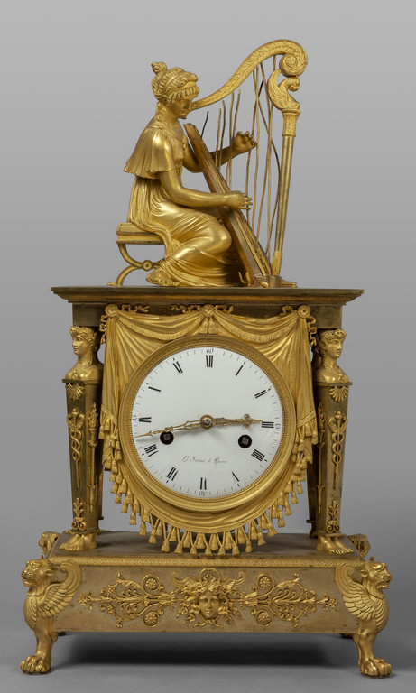 Orologio Impero in bronzo dorato sormontato da figura di suonatore d'arpa quadrante firmato 'Le Jeune à Paris' Francia inizi sec.XIX