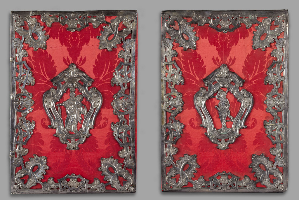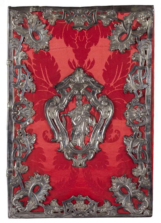 Coperta per Vangelo da altare in argento finemente sbalzato e cesellato su supporto rivestito in seta. frontespizio con placca centrale raffigurante La Madonna del Rosario parte dorsale con placca raffigurante San Sebastiano punzone della Torretta anno 1727