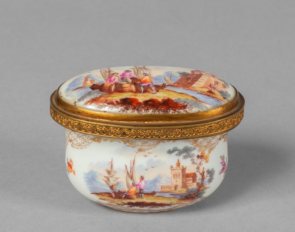 Scatolina in porcellana finemente decorata con veduta di porto marchio doppia 'C' inizi sec.XIX