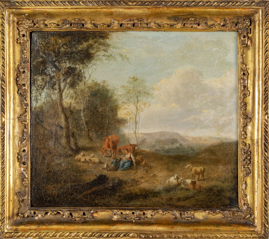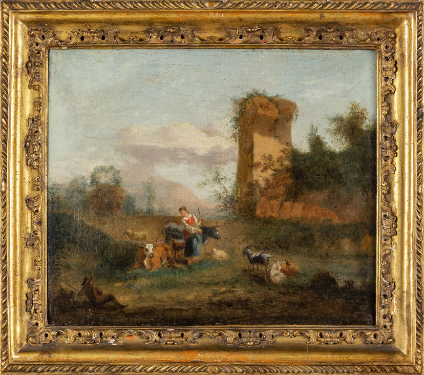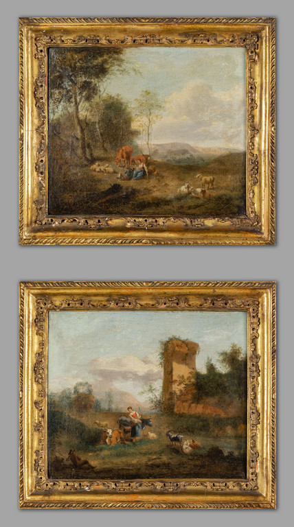 Scuola veneta sec.XVIII 'Scene bucoliche' coppia di olii cornici in legno intagliato e dorato