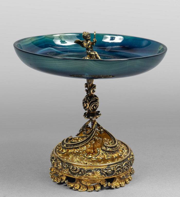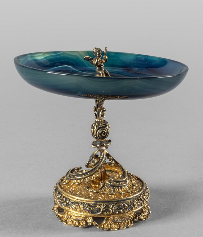 Alzatina in argento finemente sbalzato e dorato con piatto in agata inizi sec.XX