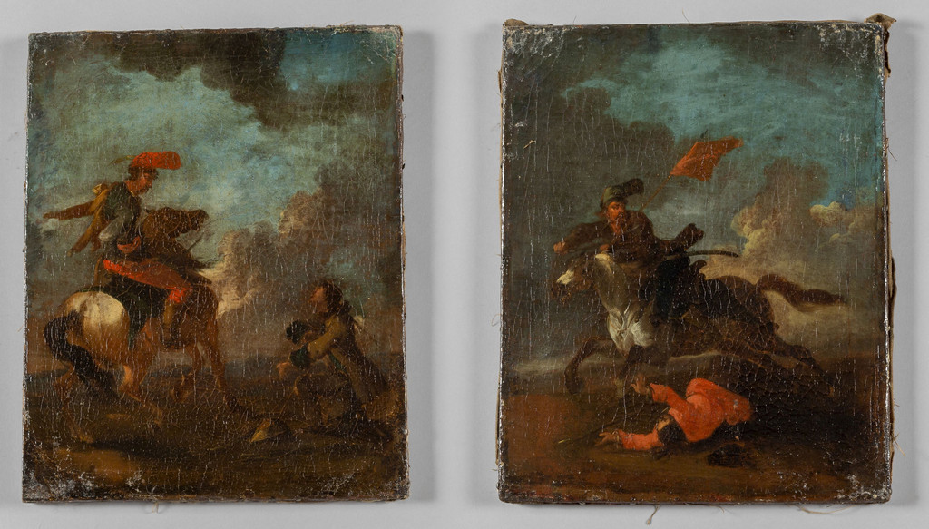 Scuola Nord Europea sec.XVIII 'Battaglie' coppia di olii