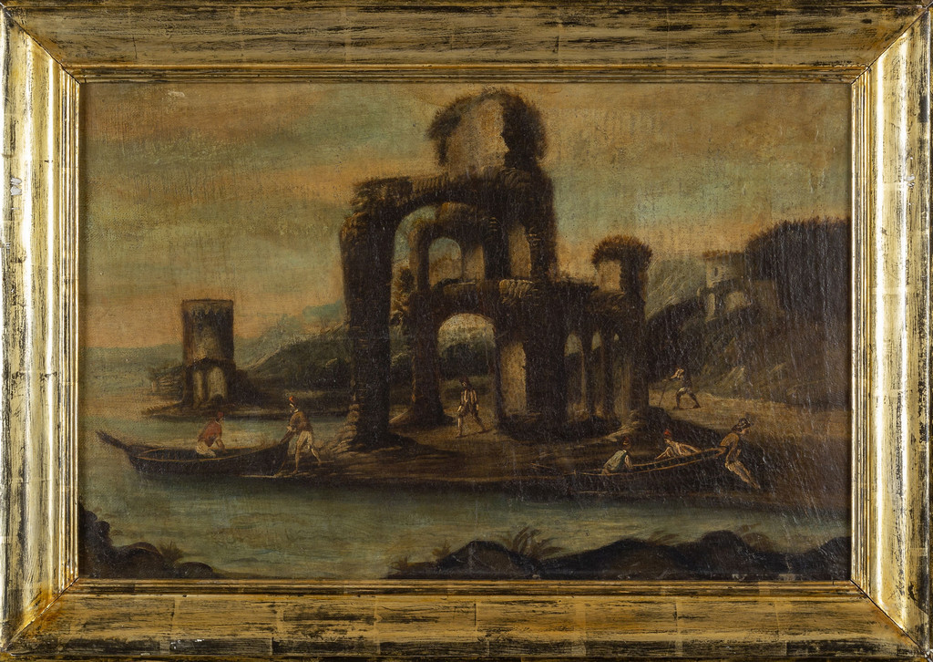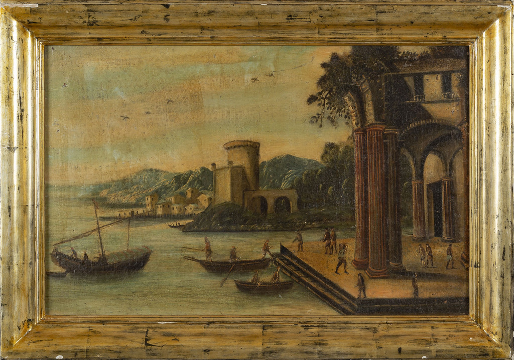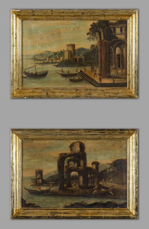 Scuola genovese sec.XVIII 'Paesaggi marini con figure' coppia di olii
