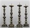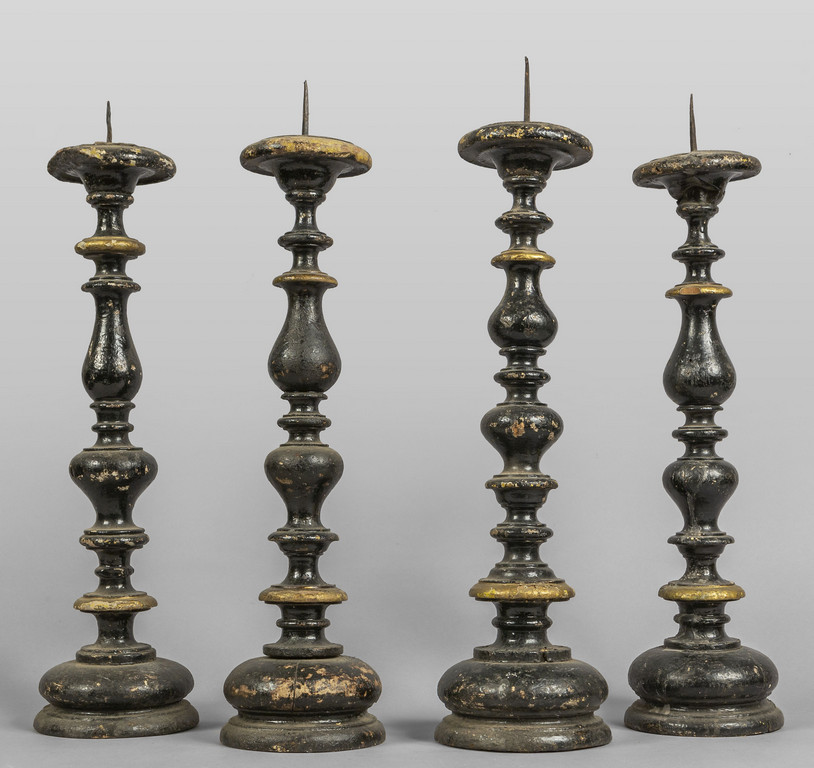 Quattro candelieri a rocchetto in legno laccato nero e oro sec.XVIII