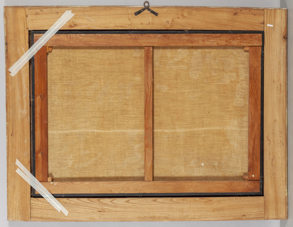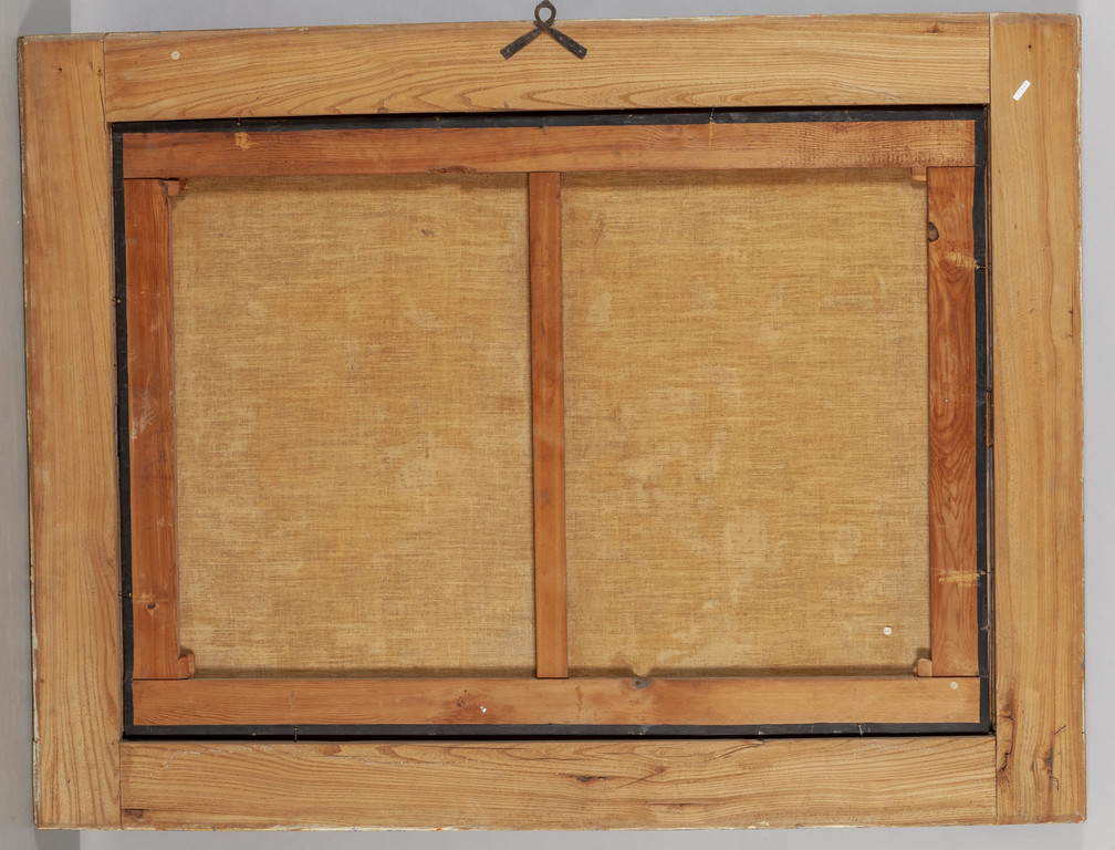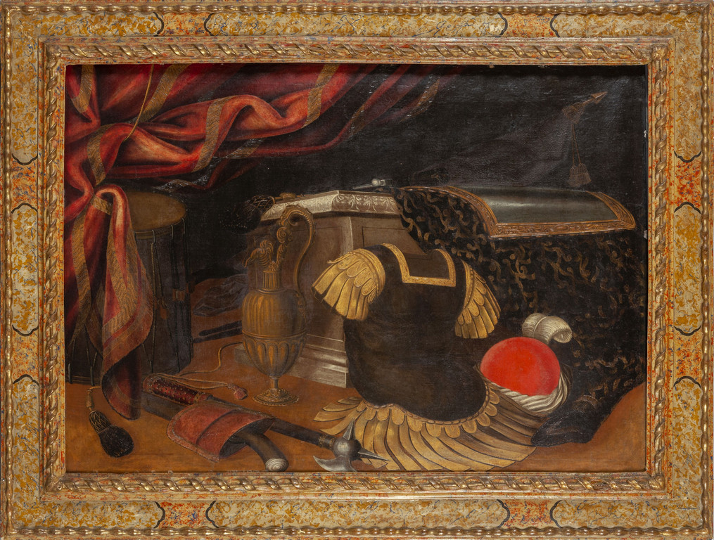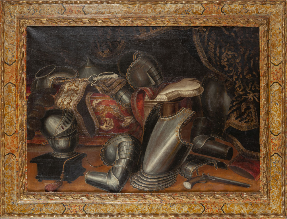 Scuola lombarda sec.XVII 'Armature' coppia di olii cornici in legno intagliato dorato e marmorizzato