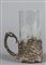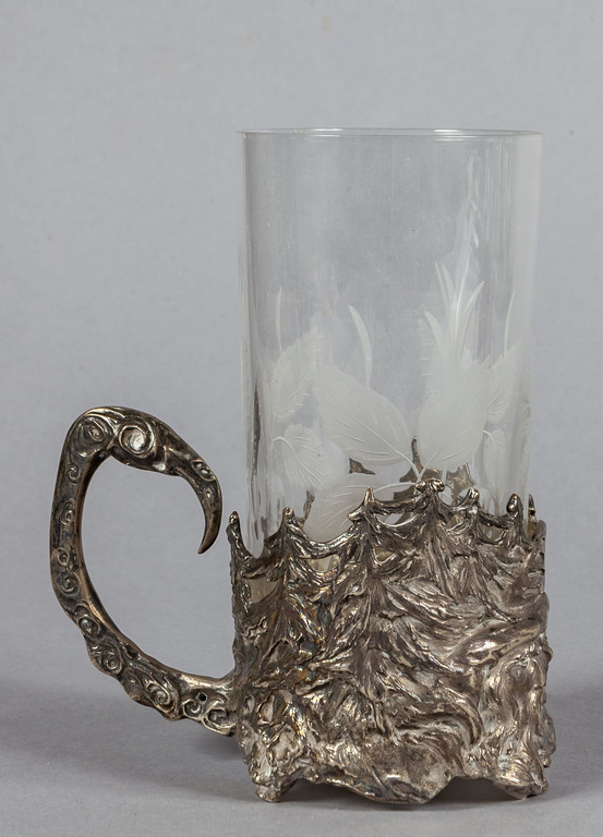 Portabicchiere da thè in argento sbalzato raffigurante un bosco da cui emergono due teste incappucciate quella di un vecchio barbuto e di un ragazzo reca la firma di fabbrica A.T. iniziali in cirillico Mosca 1899-1908 marchio oggetti di piccole dimensioni
