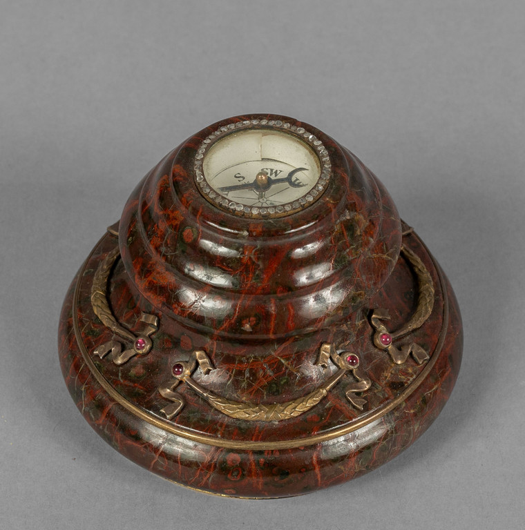 Bussola inserita in un cerchio di diamantini entro una pietra degli Urali di color marrone marmorizzato con fregi a ghirlanda in argento dorato e rubini cabochon reca la firma Fabergè in cirillico autore Fedor Afenasiev (iniziali in cirillico) San Pietroburgo 1908-1917