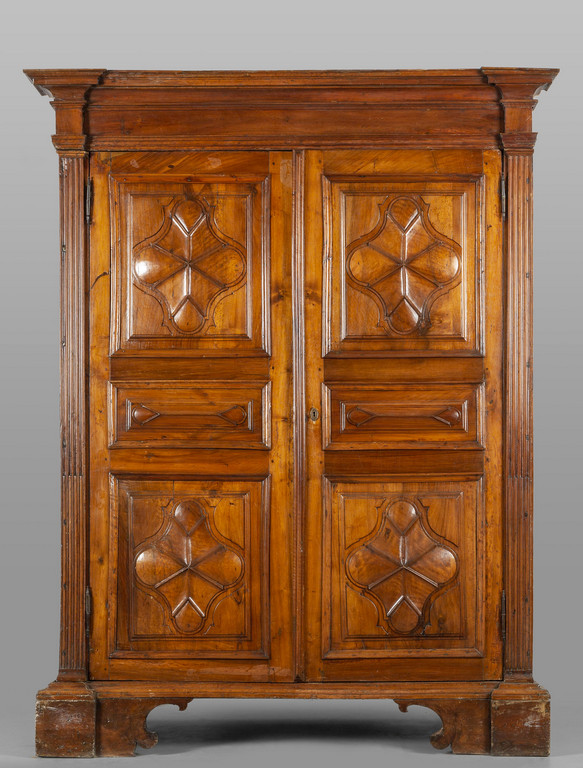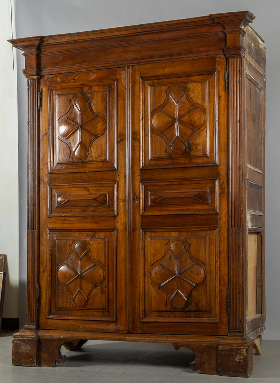 Armadio Luigi XIV in noce a due ante intagliate con il motivo del cuore montanti scanalati Genova I metà sec.XVIII (difetti e mancanze)