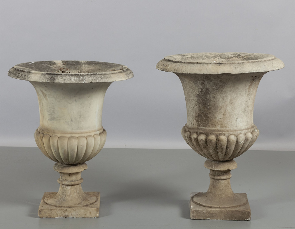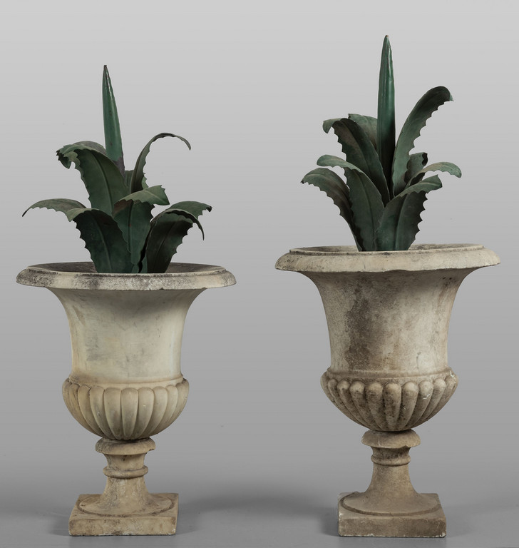 Coppia di vasi neoclassici in marmo con piantine in ferro battuto