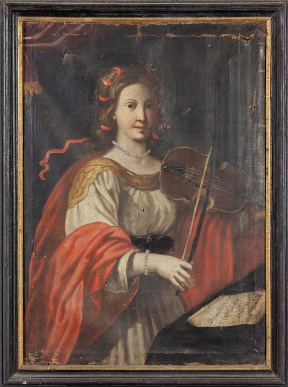 Scuola emilina sec.XVII 'Santa Cecilia patrona della musica' olio cornice coeva in legno ebanizzato e oro