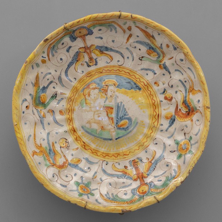 Crespina in maiolica decorata a gran fuoco raffigurante la Madonna dei bagni circondata da raffaellesche Deruta sec.XVII