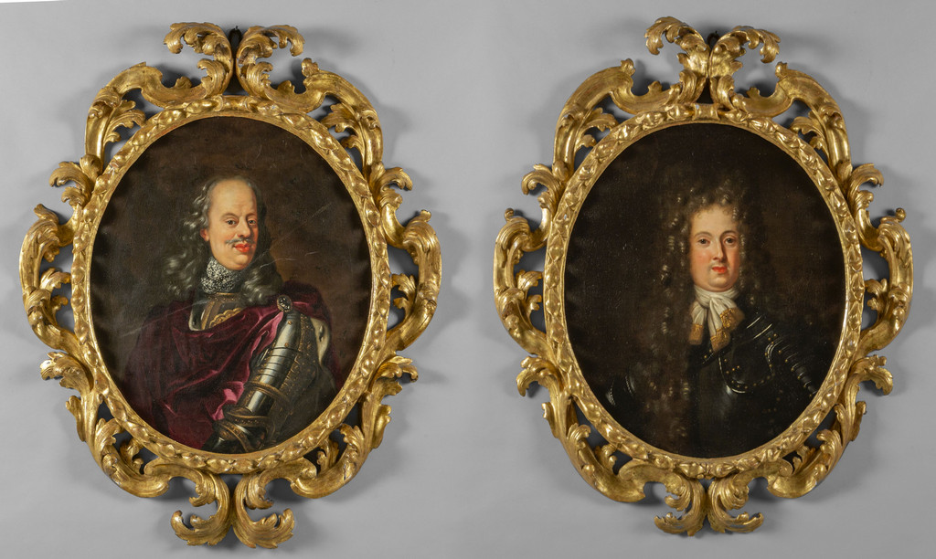 Scuola toscana sec.XVII (Anton Domenico Gabbiani) 'Cosimo III Gran Duca di Toscana' e 'Ferinando De Medici' coppia di olii cornici a volute in legno intagliato e dorato