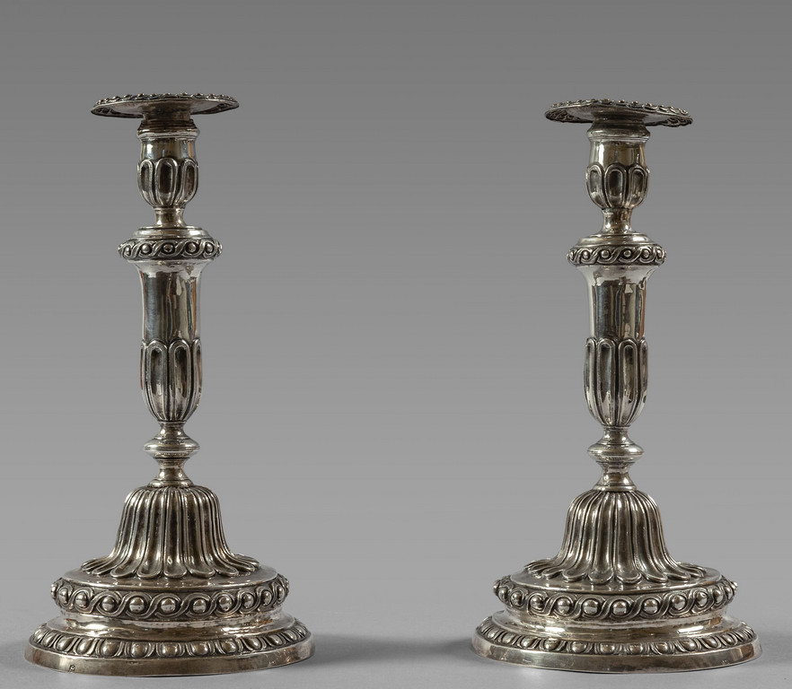 Coppia di candelieri Luigi XVI in argento finemente sbalzato Genova punzone della Torretta sec.XVIII