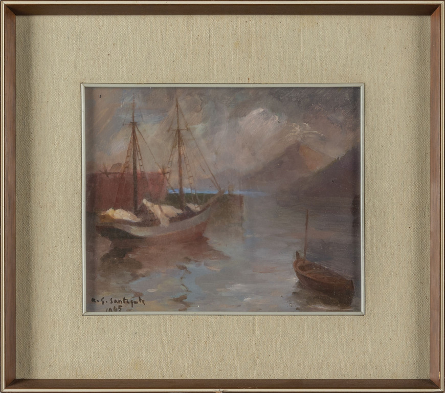'Peschereccio a riposo' olio su tavoletta cm.30x25