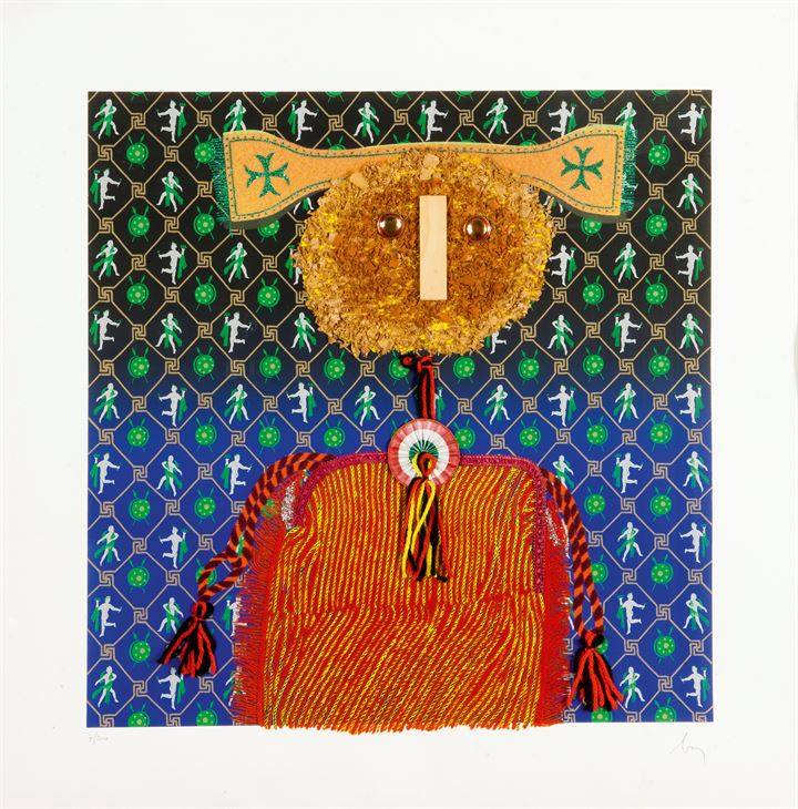 63x62 foglio, 49,5x49,5 litografia a colori con applicazioni in passamaneria, legno e feltro; es. 7/200