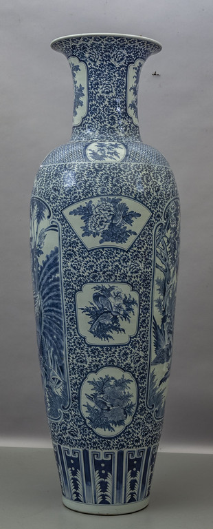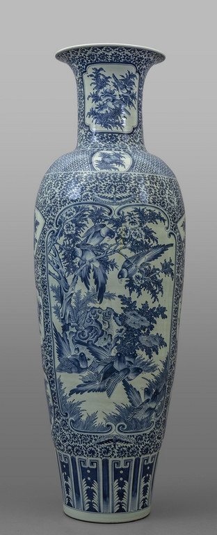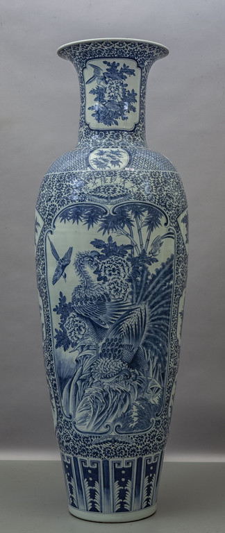 Grande vaso in porcellana bianca e blu decorato a motivi geometrici con riserve a paesaggi Cina sec.XX