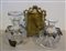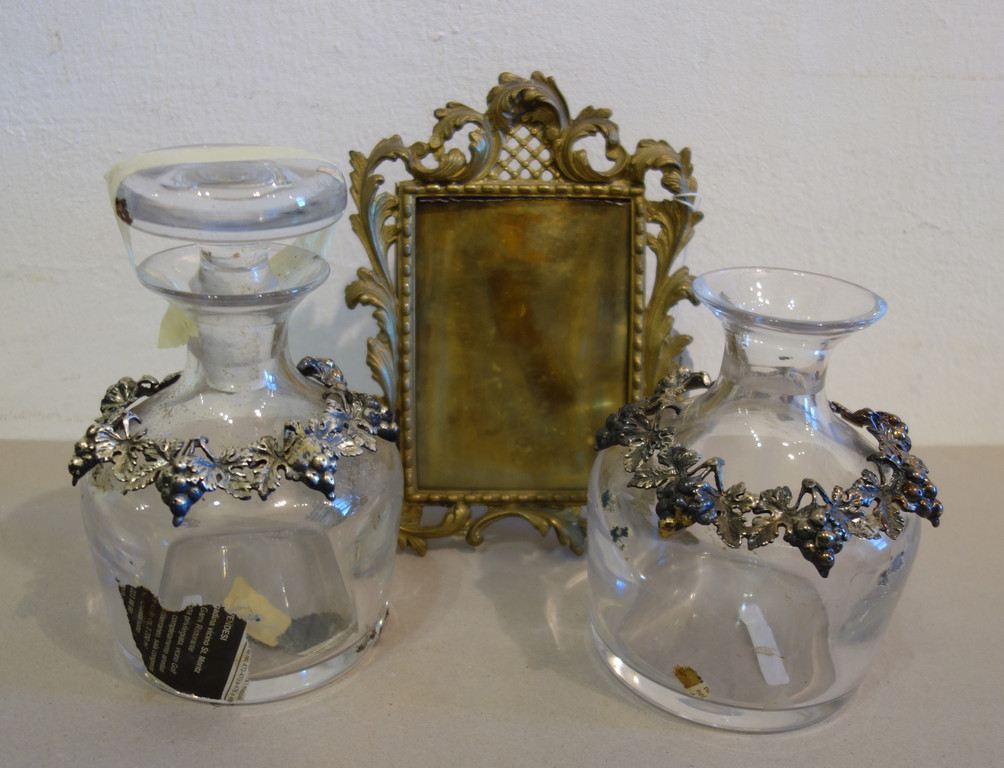 Due bottiglie (una senza il piatto) e una cornicetta in bronzo