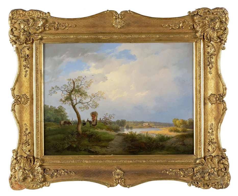 'Paesaggio con contadina' olio su tavola palchettata sec.XIX