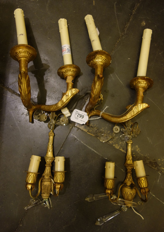 Coppia di braccetti in legno intagliato e dorato sec.XVIII e coppia di apliques in metallo
