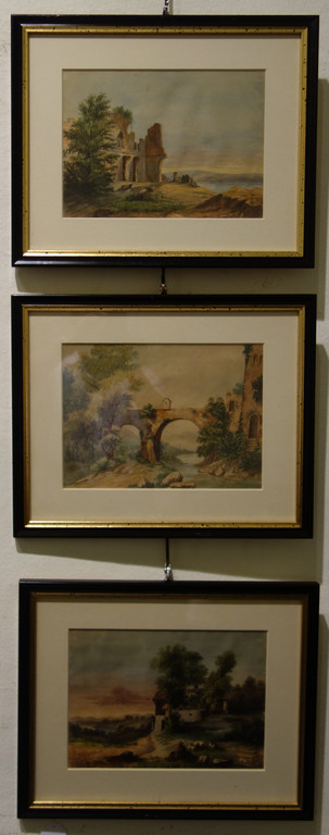 'Paesaggi con rovine' tre acquarelli fine sec.XIX