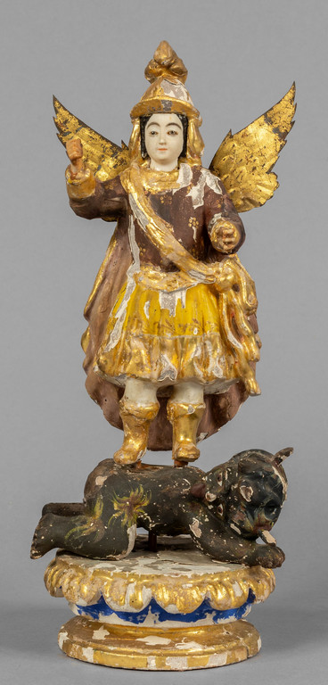 L'Arcangelo Gabrilele scaccia il demonio scultura in legno intagliato laccato e dorato con applicazioni Spagna sec.XVIII