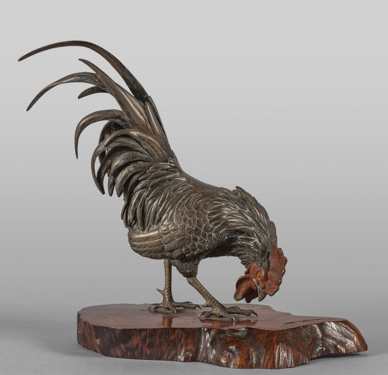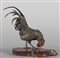 Grande gallo in bronzo argentato base in legno firmato in giapponese nella pancia Giappone sec.XX