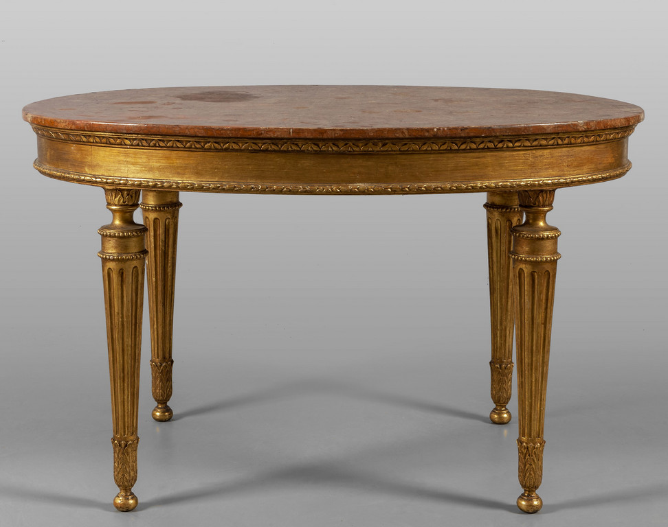 Tavolo da centro in stile Luigi XVI fascia e gambe dorate piano laccato a finto marmo