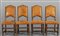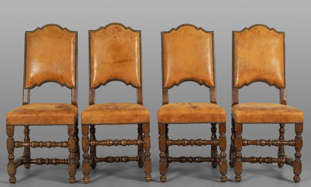 Quattro sedie a rocchetto in noce ricoperte in cuoio borchiato sec.XVIII (difetti)