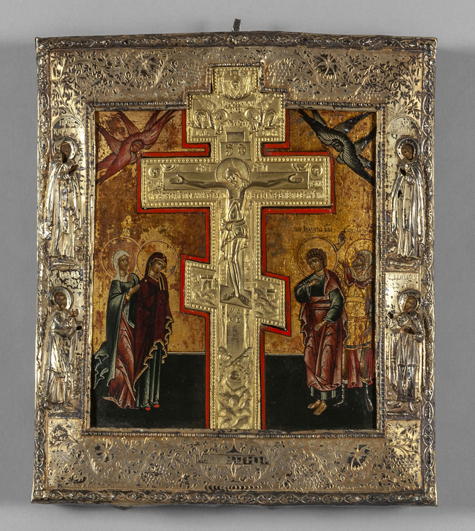 Icona con al centro Crocifissione in metallo dorato contornata da figure dipinte a fondo oro riza in argento sbalzato Russia sec.XVIII