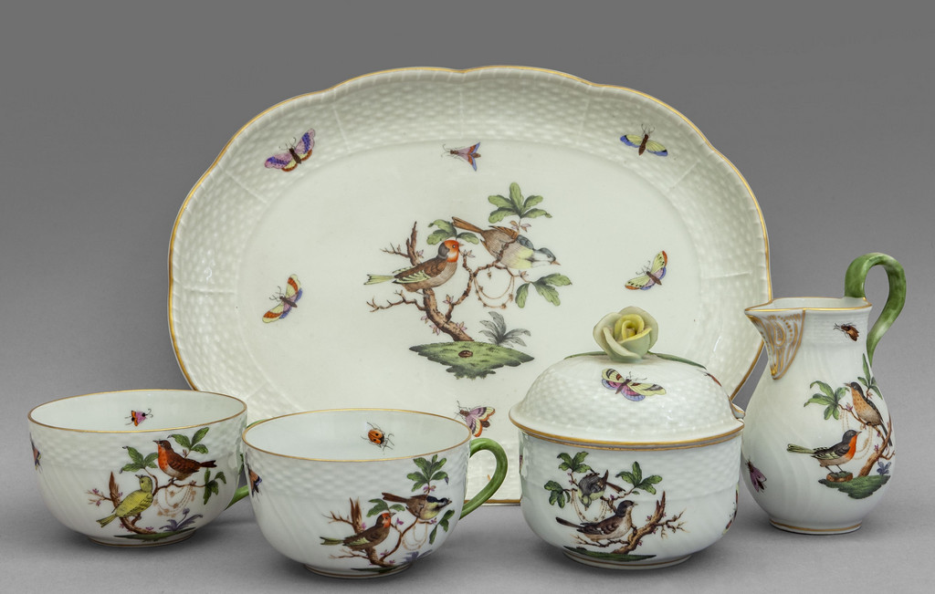 Servizio da thè in porcellana Herend dipinta a mano marchio delle celebrazioni per il centenario della fabbrica (1839-1939) decorata su fondo bianco con uccellini sui rami.