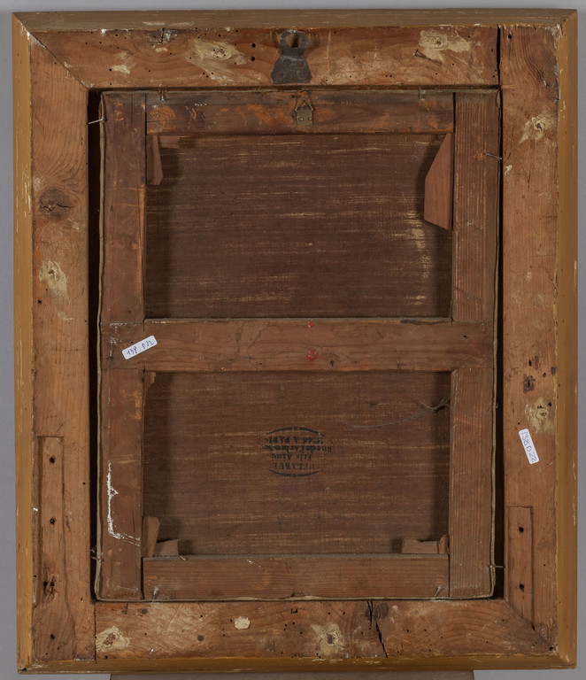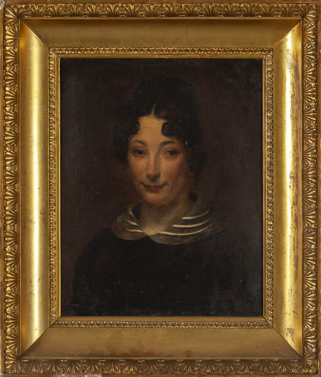 Scuola francese sec.XIX 'Ritratto di dama con colletto bianco' olio cornice coeva in legno intagliato e dorato