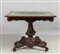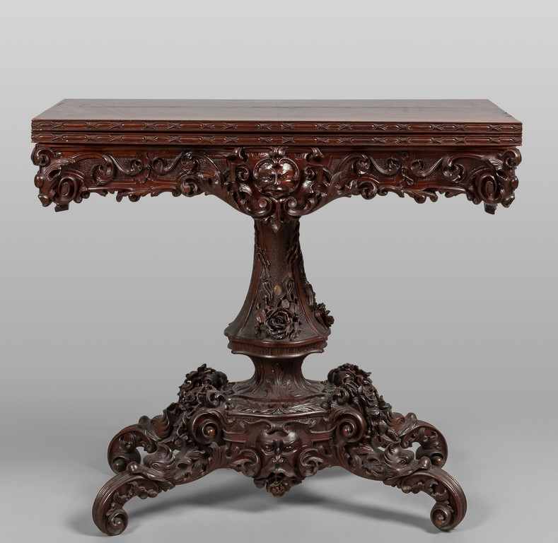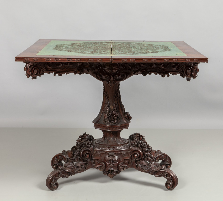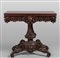 Tavolo da gioco in mogano gamba centrale e fasce laterali riccamente scolpito cassettini laterali Genova metà sec.XIX (H.T.Peter)