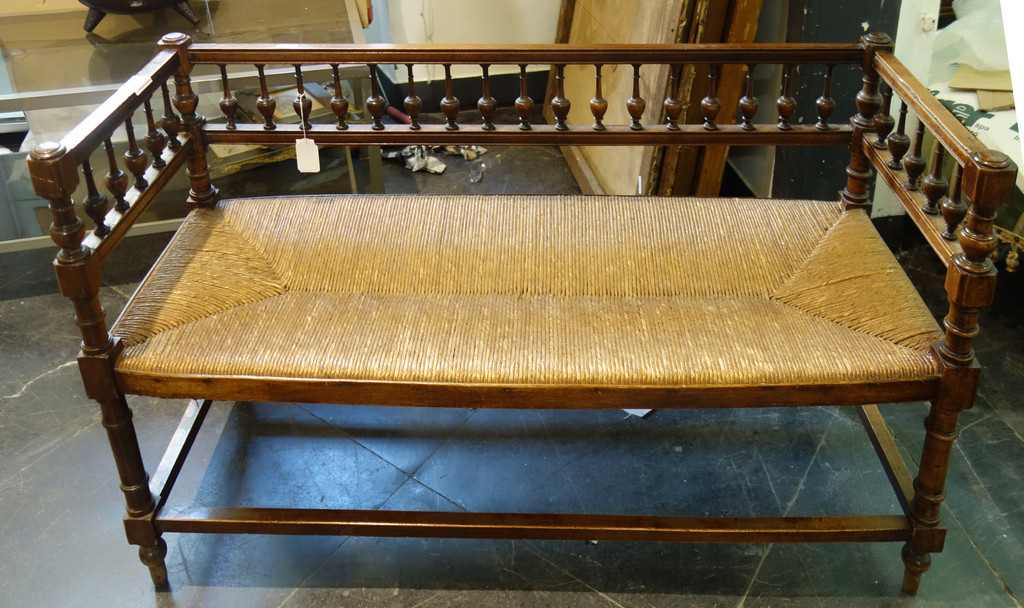 Divanetto in noce con schienale a birilli e seduta in paglia di Vienna sec.XX