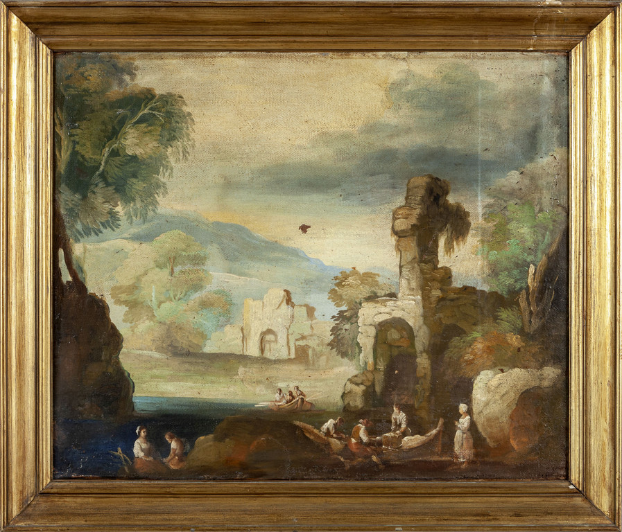 Scuola italiana sec.XIX 'Giovani contadinelli con veduta marina sullo sfondo' olio f.to in b. a s.