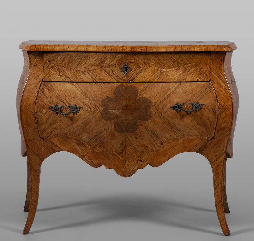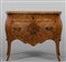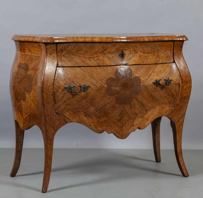 Comò in stile Luigi XV a due cassetti lastronato ed intarsiato con il motivo del cuore Genova sec.XX