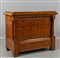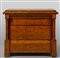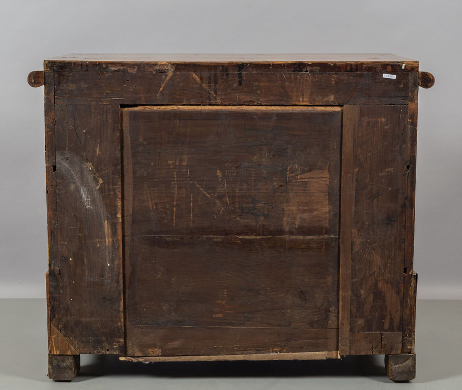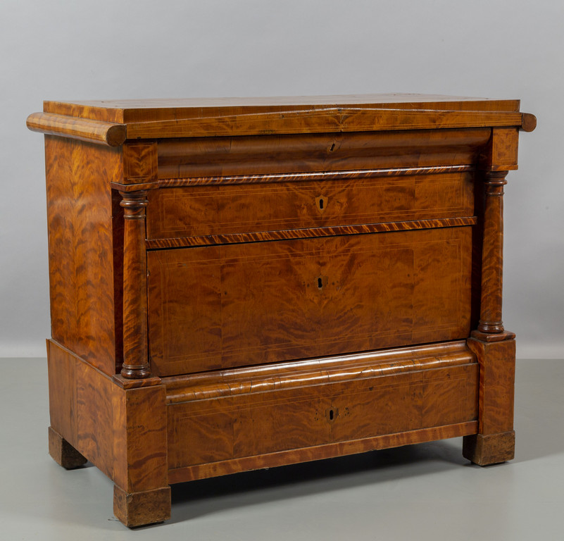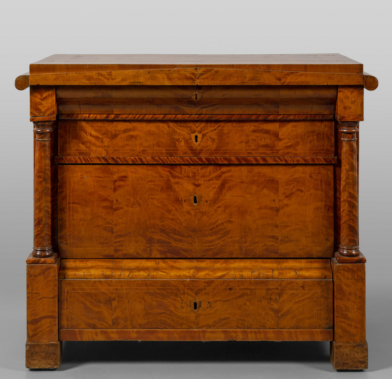Comò neoclassico tre cassetti sul fronte più un cassetto nel sottopiano arricchito da colonne con timpano lastronato in radica Nord Europa I metà sec.XIX