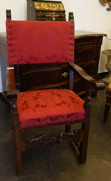 Poltrona in stile rinascimentale foderata in damasco rosso