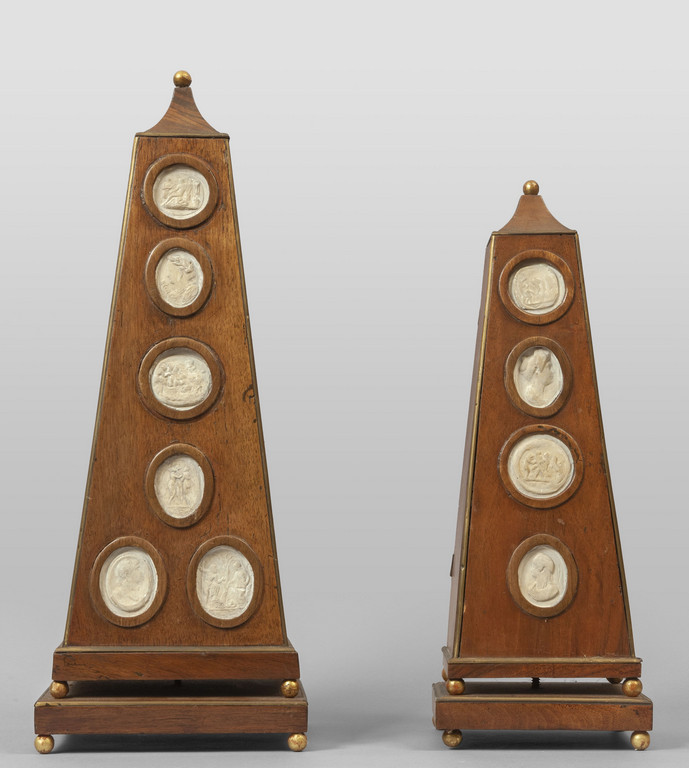 Due obelischi in legno con cammei in gesso sec.XIX