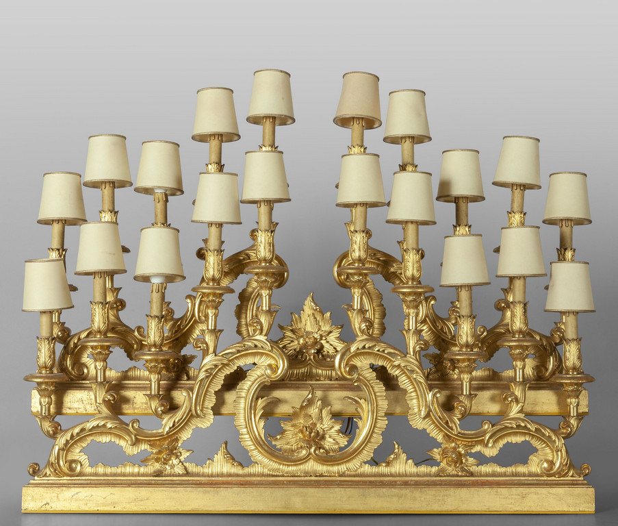 Coppia di grandi candelieri a dieci luci in legno intagliato e dorato sec.XIX