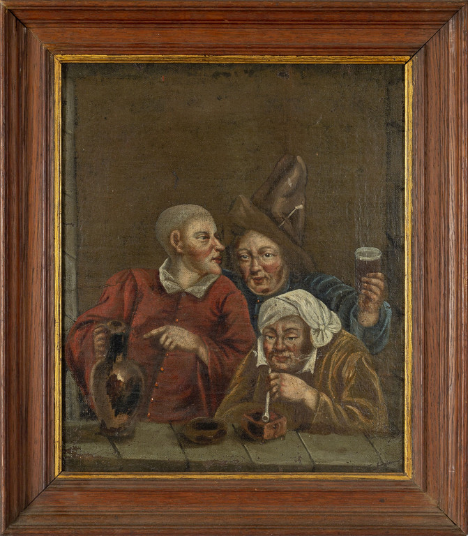 Scuola fiamminga sec.XIX 'Tre personaggi all'osteria' olio