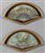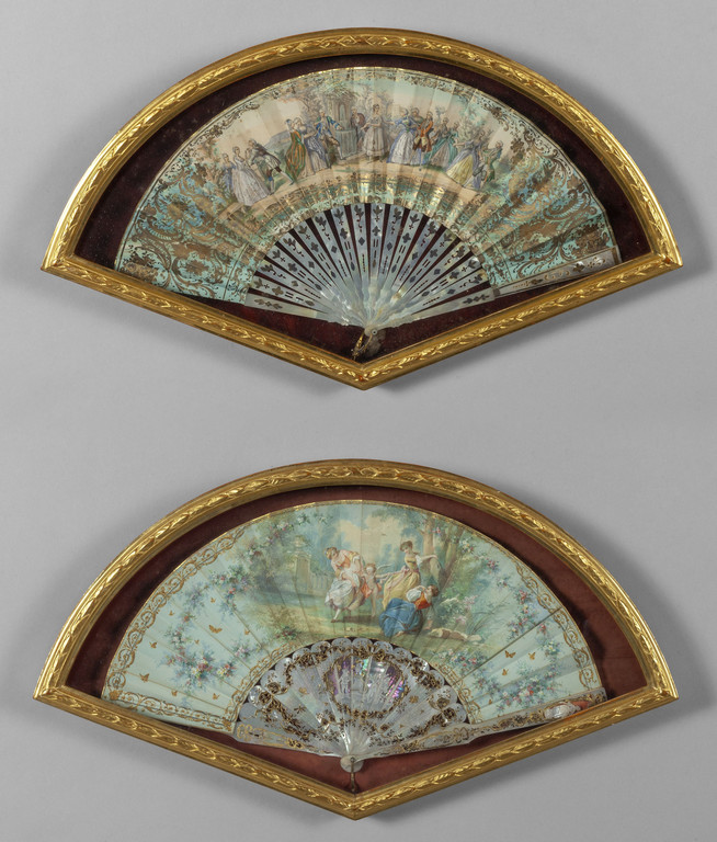 Coppia di ventagli con scene romantiche stecche in madreperla cornici in legno intagliato e dorato