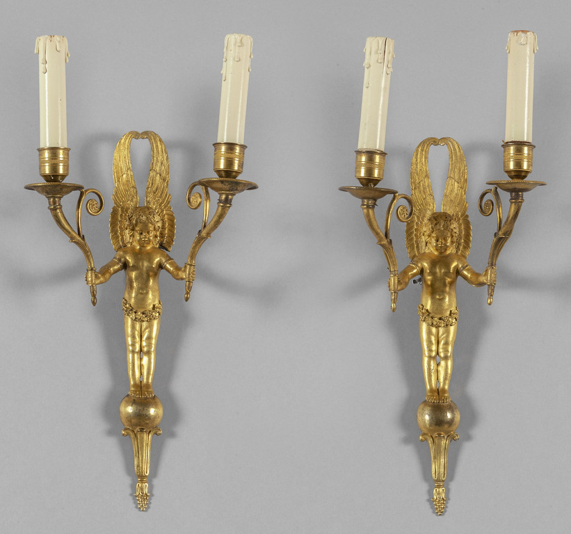 Coppia di apliques in bronzo dorato a due luci sorrette da putto alato inizi sec.XIX
