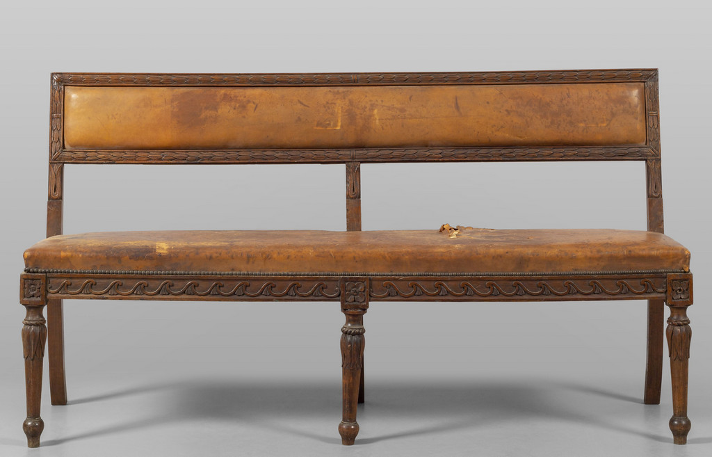 Panca con schienale Luigi XVI in noce con imbottitura in pelle Emilia fine sec.XIX