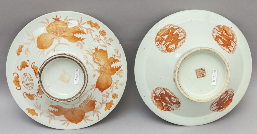 Due alzate in porcellana decorate con draghi pipistrelli e frutta in arancione su fondo bianco marcate fine sec.XIX