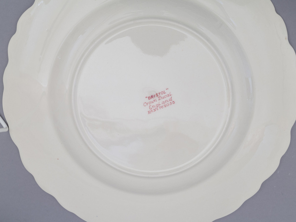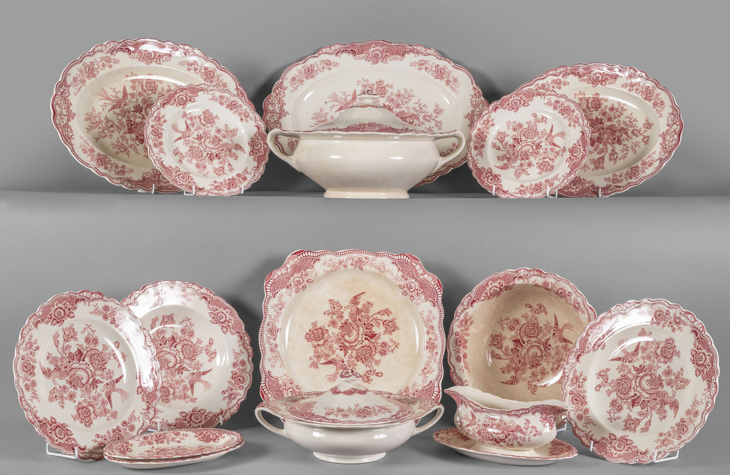 Servizio di piatti Crawn Ducal Bristol decorato con fagiani asiatici composto da: 36 piatti piani 11 frutta 12 fondi zuppiera legumiera insalatiera salsiera coppia di raviere e 4 piatti da portata ovali