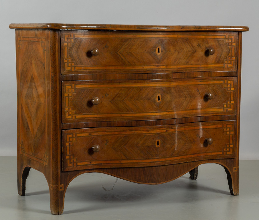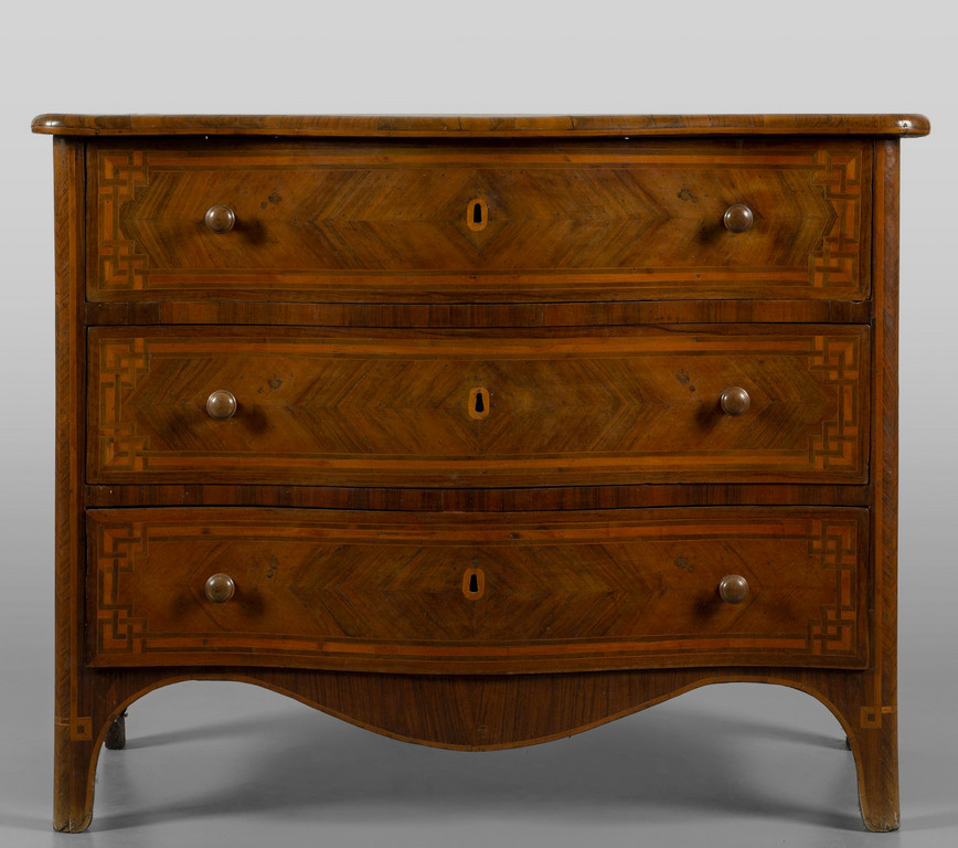 Cassettone Luigi XIV a tre cassetti separati da traverse lastronato e filettato in palissandro e legno di frutta Piemonte metà sec.XVIII