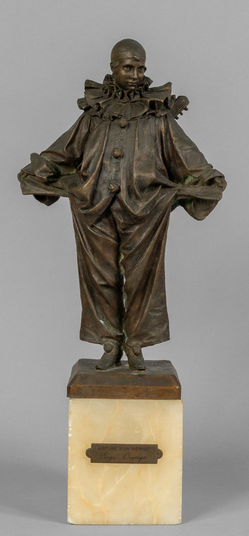'Historie di un pierrot' bronzo a patina scura con base in alabastro